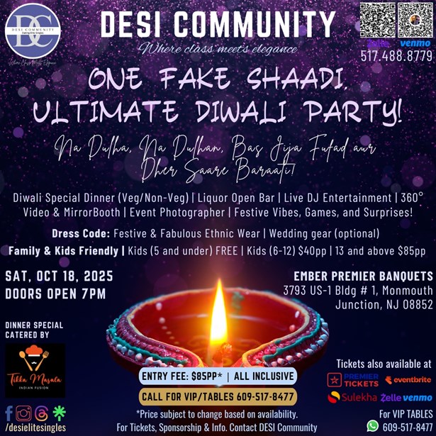 Buy ticketsEvent InfoVenueArtists Info Videos GalleryT & C FAQ Covid-19 Info Buzz Ticket Information Pay $0.00Register Kids Under 5 $0.00 Available 0 1 20 Ticket close on Oct 18 Kids Entry (6 - 12) $40.00 Available 0 1 20 Ticket close on Oct 18 Adult Entry (per person) $85.00 Available 0 1 2 3 4 5 6 7 8 9 100 Ticket close on Oct 18 Table of 8 $680.00 Available 0 1 2 3 4 5 6 7 8 9 100 Ticket close on Oct 180 Tickets / Total: Pay $0.000 Tickets Register Order Summary Tickets Order Summary Amount Payable $ Event Details 🪔💍 DESI Community Presents One Fake Shaadi. Ultimate Diwali Party. 🎉✨📅 Saturday, Oct 18 | 7PM Onward📍 Ember Premier Banquets, NJ🎟️ $85 Adults | $40 Kids (6–12) | Under 5 FREE🎭 "Na Dulha, Na Dulhan... Bas Jija, Fufad aur Dher Saare Baraati!"👨👩👧👦 Family-Friendly. Singles-Approved. Perfect for Social Butterflies! Total Dhamaal. Fashion Show. Dance Performances. Live DJ to keep us on the floor all night!🪩 Hottest singles to couples joining in with festive vibes — everyone’s welcome!👗 Dress Code: Festive & Fabulous Ethnic Wear🍛 Diwali Special Dinner (Veg & Non-Veg w/ appetizers and desserts)🥃 Open Liquor Bar🎧 Live DJ + Packed Dance Floor📸 360° Videos & Photo Booth & Desi Surprises!⚠️ Limited-time pricing. Subject to change based on availability.🎇 Bring your crew, your kids, or just your swag — this is the Diwali celebration for everyone!https://www.instagram.com/p/DPCfLZQAS_M/Venue Details Ember Premier Banquets3793 U.S. Route 1 , Monmouth Junction , NJ 08852 X Report Error Is the information provided incorrect? Report it now! Event has been cancelled Event has been postponed This is an Adult event Event is fake/Inappropriate/Duplicate This event is a spam Please remove this event This event is private About this eventExperience the Extravaganza of "One Fake Shaadi, Ultimate Diwali Party!" Embrace the festive spirit of Diwali with an enchanting event "One Fake Shaadi, Ultimate Diwali Party!" hosted by the dynamic DESI community. Scheduled to be held on the 18th of October, 2025, this multilingual extravaganza promises an unforgettable evening filled with laughter, joy, and festive cheer. Immerse yourself in the vibrant cultures of Hindi, Gujarati, Punjabi and English communities, while enjoying the grandeur of the ultimate Diwali party. Get Mesmerized by the Captivating Performances While our artist line-up remains a surprise, rest assured that the event will feature captivating performances that will leave you spellbound. Expect a mix of traditional and contemporary art forms, showcasing the rich cultural heritage of India. With their unique style and charisma, our artists will ensure an evening of entertainment and cultural immersion like no other. Discover the Charm of Ember Premier Banquets The event is set to take place at the prestigious Ember Premier Banquets, located at 3793 U.S. Route 1, Monmouth Junction, NJ, United States. This prime location is well-known for its safe and accessible environment, along with a wide array of nearby attractions to explore. Parking won't be an issue as ample space is available for attendees. And if you want to add more flavor to your night, numerous Indian restaurants near the venue offer a variety of delicious cuisines. Secure Your Spot - Ticket Details Tickets are available in various categories to suit everyone's needs. Kids under the age of 5 can enjoy the event for free. For children between 6 to 12 years, the ticket price is $40. Adult entry is priced at $85 per person. A special offer is available for groups with a table of 8 available for $680. Secure your spot now and make this Diwali a memorable one. Terms & Conditions1. Tickets once purchased cannot be modified or cancelled. Refunds will be initiated only in case of event cancellation. 2. Transaction fee per ticket may be levied. Please check the total amount before payment. 3. Organizers hold the right to deny late entry to the event. Hence, we recommend reaching the venue an hour before the event starts to ensure smooth entry. 4. If an event is canceled/postponed, Sulekha will refund only the face value of the ticket and NOT the transaction fee. 5. Every venue has its own rules and regulations. They hold the right to deny entry on the basis of the same. 6. These terms and conditions are subject to change from time to time at the discretion of the organiser. 7. Important Alert: Tickets purchased from third parties are not authorized by Sulekha and will be denied entry. Buy only from Sulekha to ensure valid access. 8. As per current New Jersey Area mandatory health requirements, all attendees must present proof of a COVID-19 vaccination in order to enter the venue and attend the show. 9. Mask wearing is mandatory for all. 10. The venue reserves the right to alter safety protocols at any time and at its sole discretion of the management. 11. The event organizers value the safety of our audiences, artists, and staff. FAQ's How do I purchase tickets? There are several options when buying tickets: You can purchase any ticket to any events listed on our website. To buy, select the # of tickets you want to purchase in the dropdown of a specific event and follow the instructions. Email. Not sure where to go or how to buy tickets? Email us at us.sulekha@sulekha.com. Phone. You can purchase tickets over the phone 1-512-788-5300 (Mon to Fri - 11am to 8pm – EST) What is Sulekha's Refund Policy? All sales are final. No Refunds will be issued under any circumstance unless an event is canceled or rescheduled. If you event is canceled, in most cases you won't need to do anything. We will inform you about the cancelation and face value of the ticket will be refunded to your account, NOT the transaction fee. Refund will be processed by the same payment method used for purchase. By purchasing tickets you are accepting these terms. If you have any questions, please email us at us.sulekha@sulekha.com or call 1-512-788-5300 (Mo