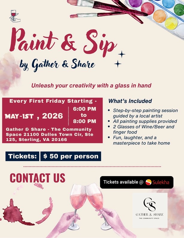The Paint & Sip event takes place at the vibrant venue, Gather & Share, located at 21100 Dulles Town Circle, Sterling, VA, United States. Nestled in the heart of Sterling, this venue is known for its safe and accessible location. Easy parking availability adds to the convenience, making it a perfect spot for this fun-filled event. While you're in the area, don't forget to explore the various nearby Indian restaurants, offering aromatic and authentic culinary delights.