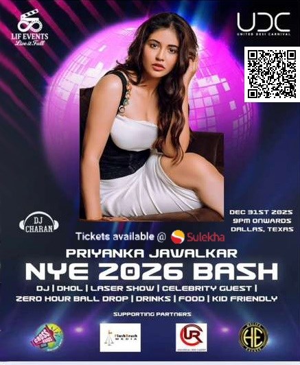 Get ready to sparkle and shine as we bid farewell to 2025 and usher in 2026 with the most electrifying New Year's Eve party in Dallas. The Priyanka Jawalkar NYE 2026 Bash in Texas, organized by United Desi Carnival (gigmonk.com), is all set to dazzle you on the night of December 31st, 2025. Indulge in a night filled with pulsating English and Hindi music, scrumptious food and drink, and an unforgettable party atmosphere. This New Year Event is a joyous blend of music, dance, and cultural fusion that will keep you entertained until the early hours of the New Year.