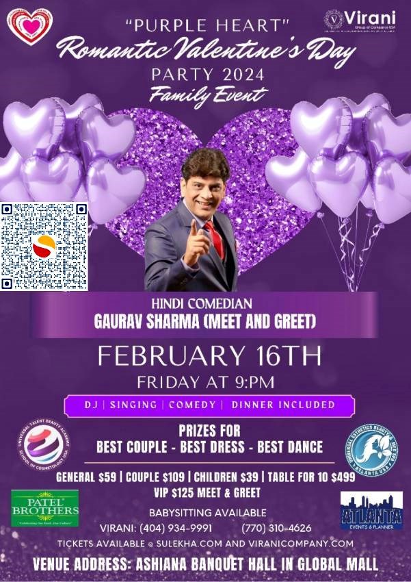 #ViraniValentines #HelloAtlanta #GauravSharmaLive #LoveAndLaughter #ValentinesParty #AtlantaEvents #HeartfeltHilarity #AashiyanaBanquet #GlobalMallMagic #ViraniEntertainment #9thValentinesCelebration