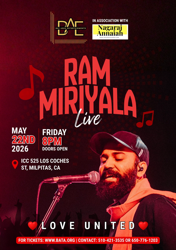 Mark your calendars for the 22nd of May, 2026 as the Bay Area Telugu Association presents an unforgettable evening with the sensational Ram Miriyala. The Indian playback singer, film scorer, and music composer is all set to take the stage for a Live in Concert, creating a symphony of Telugu melodies. This enchanting musical night will commence at 9:00 PM, promising a mesmerizing journey through the soulful realms of music.