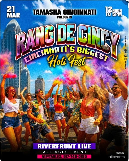 Experience Holi, the most vibrant festival of colors, in a whole new light! Come join us at 'RANG DE CINCINNATI- HOLI COLOR FEST 2026' on the 21st of March, 2026. This grand celebration will be an unforgettable fusion of Hindi, Telugu, Tamil, Punjabi, and English cultures. Get ready to immerse yourself in a riot of colors, scrumptious food & drink, and pulsating Bollywood music. This is not just a Holi celebration, but a night party that promises an electrifying atmosphere!