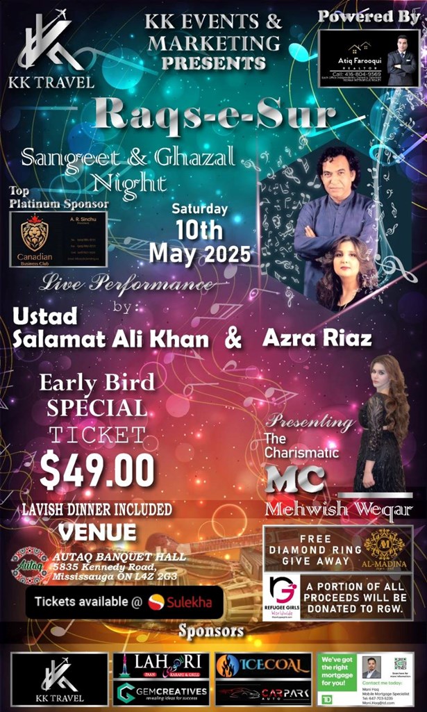 Join us for an unforgettable Sangeet Night, featuring the legendary Ustad Salamat Ali Khan and the mesmerizing Azra Riaz. This special evening promises a captivating fusion of classical and contemporary music, with soulful renditions that will take you on an emotional journey. Celebrate the magic of music with two extraordinary artists, as they bring their unique talents to create an enchanting atmosphere for all. Don't miss out on this memorable night of melody, rhythm, and celebration!