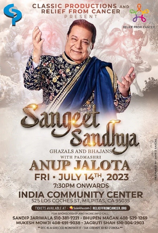 RELIEF FROM CANCER presents "Sangeet Sandhya", an evening with Padmashri Anup Jalota. Enjoy popular Ghazals & Bhajans from the maestro and his orchestra. All profits from this event will go to provide assistance to cancer patients through our nonprofits in India, CanKids and Pallium India. Join us for an enjoyable evening while donating to a good cause. More information is on our website www.relieffromcancer.org.