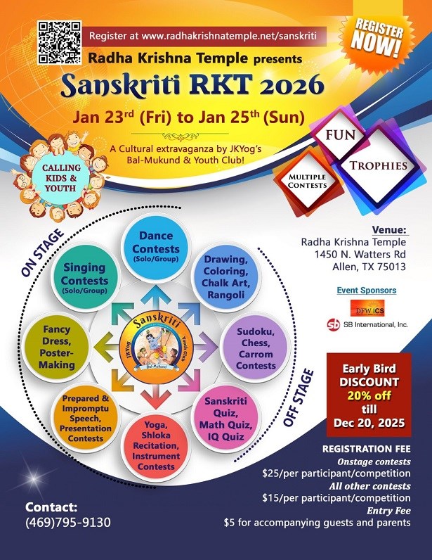 The Radha Krishna Temple of Dallas, located at 1450 North Watters Road, Allen, Texas, United States, is a hub of spirituality and culture. The serene atmosphere and stunning architecture of the temple make it a perfect venue for this event. The temple's location in the heart of Allen ensures easy accessibility and guarantees a safe environment. Parking is available on-site. After the event, guests are encouraged to explore the nearby Indian restaurants for a perfect end to their evening.