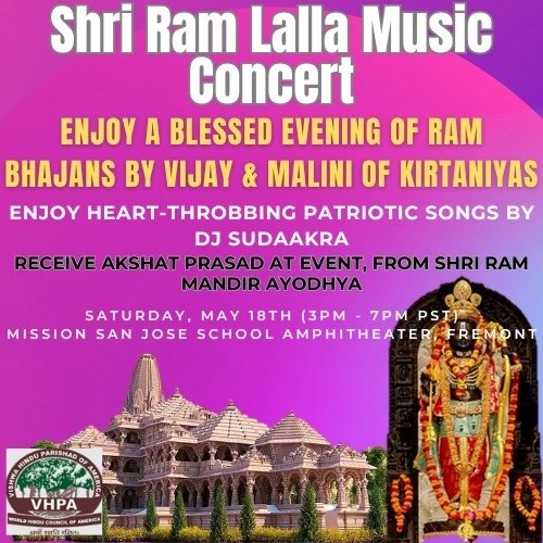 We are coming with our next enchanting evening of musical devotion to our beloved Shri Ram. Let us all Hindus of North California together celebrate and be part of a truly transcendental experience with the first of its kind "RELIGIOUS MUSIC CONCERT" on May 18th, 2024 in Fremont, CA.