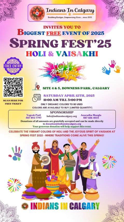 Event Details About this event Description: Spring Fest: Holi & Vaisakhi 2025 – Free Tickets Now Available Get ready for Spring Fest: Holi & Vaisakhi 2025, a grand celebration of colors, culture, and community. This family-friendly event will bring the joy of Holi and the spirit of Vaisakhi together in one spectacular festival! Date : April 12, 2025 Venue : Bowness Park, Calgary Tickets : Are Free Expect live cultural performances, interactive activities, authentic Indian & Punjabi food stalls, special guests, and a whole lot of fun! Spread the word and join us for an unforgettable Spring Fest 2025! Venue Details Venuelocation Bowness ParkBowness Park 48 Avenue Northwest , Calgary , AB T3B 2B2 Organizer Details CAD - Indians In Calgary