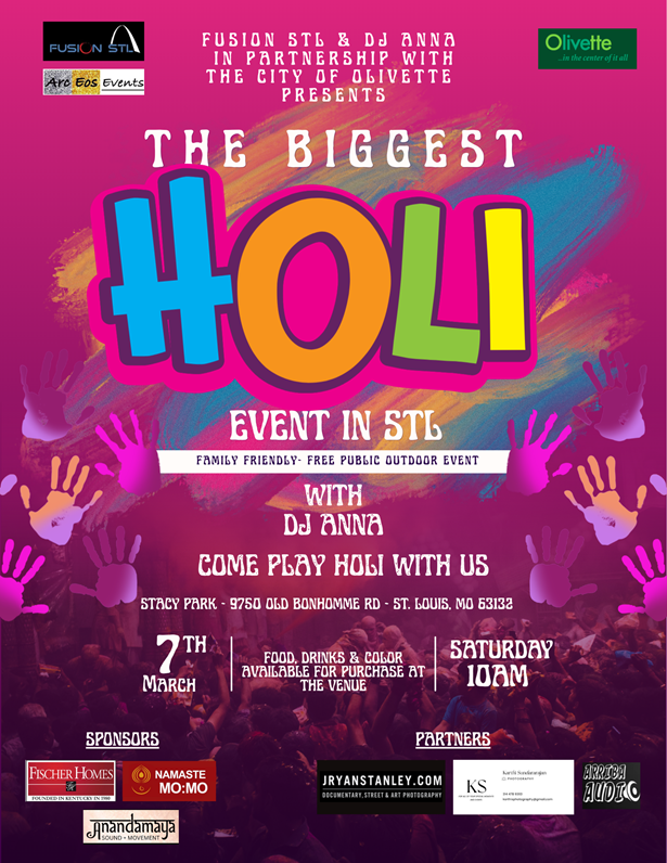 Event Details About this event We're excited to invite you back for Holi 2026 - The festival of colors!March 7, 2026 at 10:00 AM.you're already part of the Holi family and we'd love to celebrate with you again.We hope you’re able to join us! Venue Details Venuelocation Stacy Park9750 Old Bonhomme Road , Saint Louis , MO 63132 Organizer Details DJ ANNA