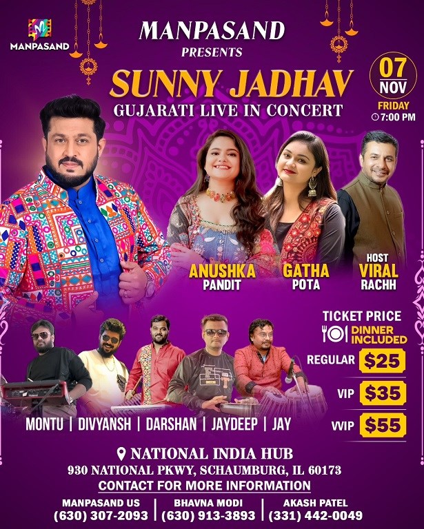 Enjoy an unforgettable evening of Gujarati music featuring Sunny Jadhav live in concert, along with performances by Anushka Pandit and Gatha Pota. Hosted by Viral Rachh.