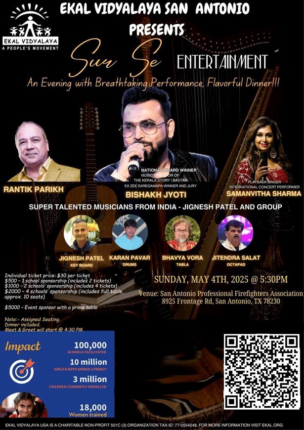 This event has ended on 4th May, 2025 HomeSan Antonio Metro Area Events San Antonio, TX Events Sur Se Entertainmet - An Evening With Breathtaking Performance Live ConcertMusicSingingHindiEnglishMultilingual Sur Se Entertainmet - An Evening With Breathtaking Performance Sun, May 4 at 5:30 PM(CDT) San Antonio Professional Firefighters Association, 8925 Frontage Rd, San Antonio, TX 78230
