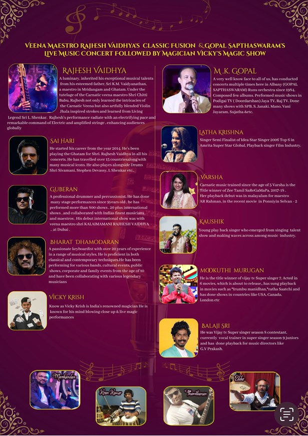 Mega Musical Event Featuring world renowned Veena Maestro "Kalai Mamani", Rajesh Vaidhya on Veena  , Sai Hari on Ghatam, Guberan professional Drummer and Percussionist  , Bharat Dhamodaran on Key Board  experienced in a range of musical styles team for Classical Fusion .Join us to experience this Visual delight this October19th , Saturday Live Concert from the Maestro himself on Movie Melodies from the ancient Indian string instrument straight and a combination with Gopal Sapthaswaram's - Live Music Concert with his team Singer Latha Krishna , Singer Varsha Krishna , Singer Kaushik , Singer Mookuthi Murugan , Singer Balaji Sri and Magician Vicky Krish. Gopal Sapthaswaram’ came into existence in 1985 as a small Orchestra, with the idea of providing quality entertainment to the music lovers of Chennai. Over the years,  their team has grown to become one of the leading light-music orchestras in the city,  USP being the never compromising quality and passion to render music.