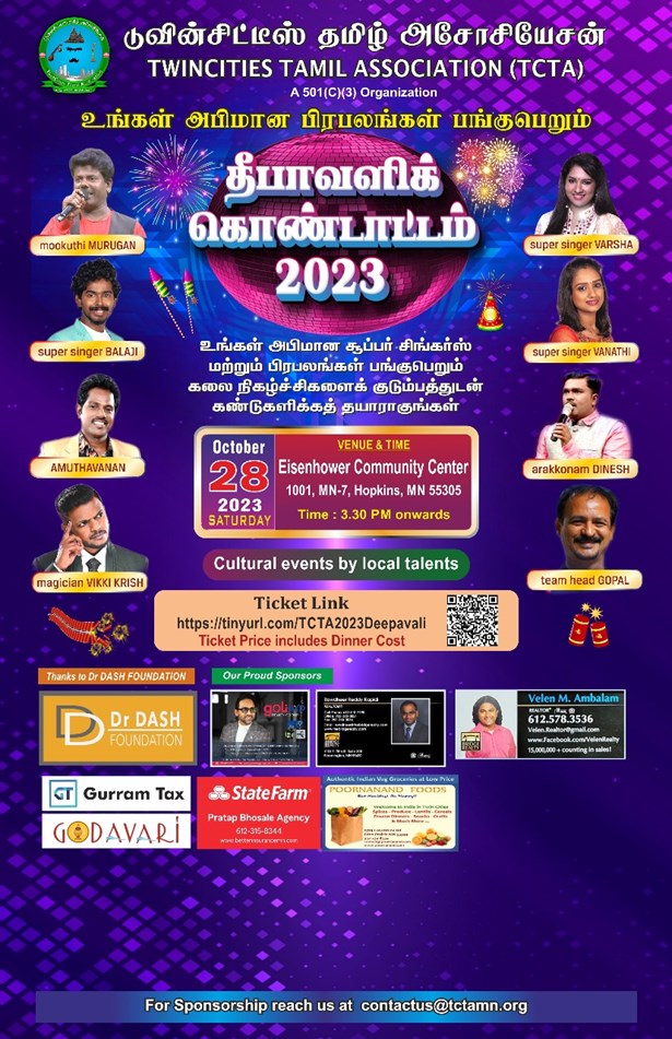 TwinCities Tamil Association inviting you with your family and friends for TCTA Deepavali Kondattam with fun filled cultural night(music, standup comedy, magic show) on Oct 28th 2023. Your support is much appreciated and motivated us to organize these kind of events.