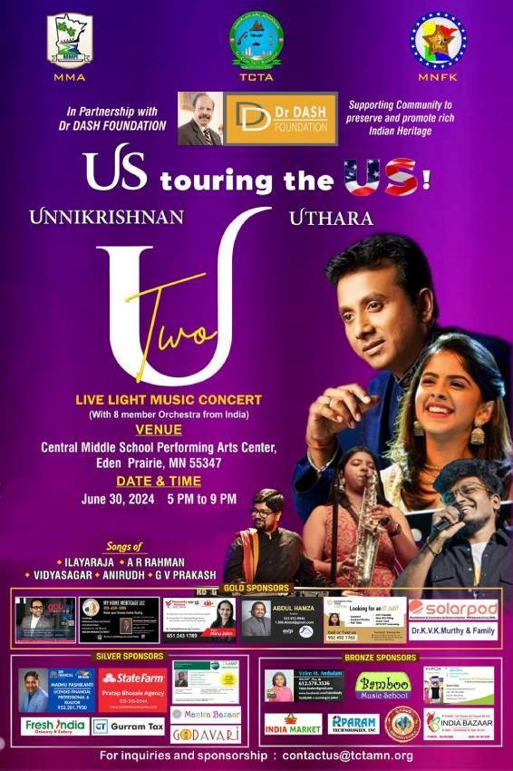Uthara's Mashup - Count down running...3 weeks to go, limited seats, Hurry up. Unnikrishnan & Uthara Live in Concert! Date: June 30th Venue: Central Middle School Performing Arts Center, Eden Prairie, MN Seating: 4:30 PM Featuring: • Unnikrishnan, legendary Carnatic vocalist • Uthara Unnikrishnan, award-winning singer • Plus more talented artists! Missed the early bird *TCTA members get 10% off with code. Join us for a soulful night!