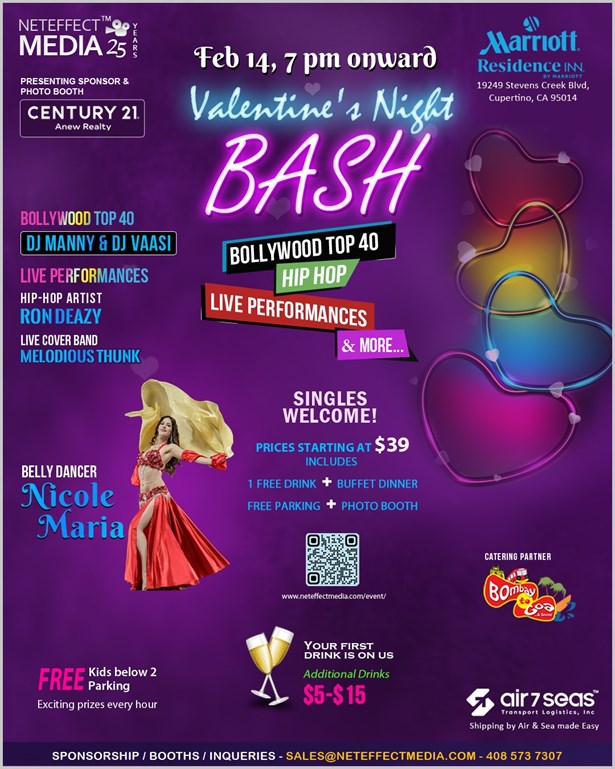 Ignite the spark of romance this Valentine's Day at the Valentine's Night BASH - Bollywood & More... This Bollywood-fueled extravaganza will take place on the 14th of February, 2026. Get ready to sway to the rhythm of Hindi, Telugu, English and Punjabi music, and enjoy a night full of dance, food, drinks and multilingual entertainment. This is not just a party, it's a celebration of love and music, Bollywood style!