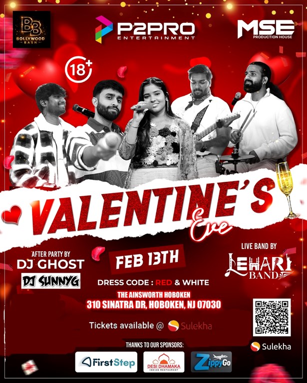Mark your calendars for the most romantic event of the year, the "Valentines Party in New Jersey", happening on the 13th of February, 2026. This enchanting evening promises an unforgettable mix of Telugu, Tamil, and Hindi music and dance, creating an atmosphere that is perfect for Valentine's day celebration. With the Lehari Band providing the soundtrack to your evening, you'll experience love in the air and rhythm in your feet at the same time.