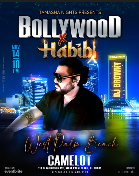 WEST PALM BEACH'S FIRST EVER BOLLYWOOD PARTY with a touch of BHANGRA music. Live a 360 degrees party experience with DJ Booth right in the middle of the crowd with DJ Browny from New York who is a master of having the crowd walk out with heels in hands.