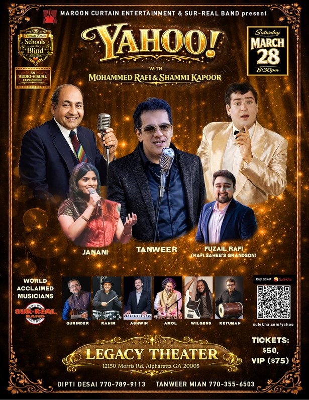 Mark your calendar for an unforgettable experience on the 28th of March, 2026, as the Legacy Theater is set to host "YAHOO! with Mohammed Rafi & Shammi Kapoor". This unique event will serenade you with the magical melodies of Hindi cinema, Bollywood music, and soulful singing. Come join us for an evening of live concert that truly embodies the spirit of classic Bollywood, ensuring a night that you will remember forever.